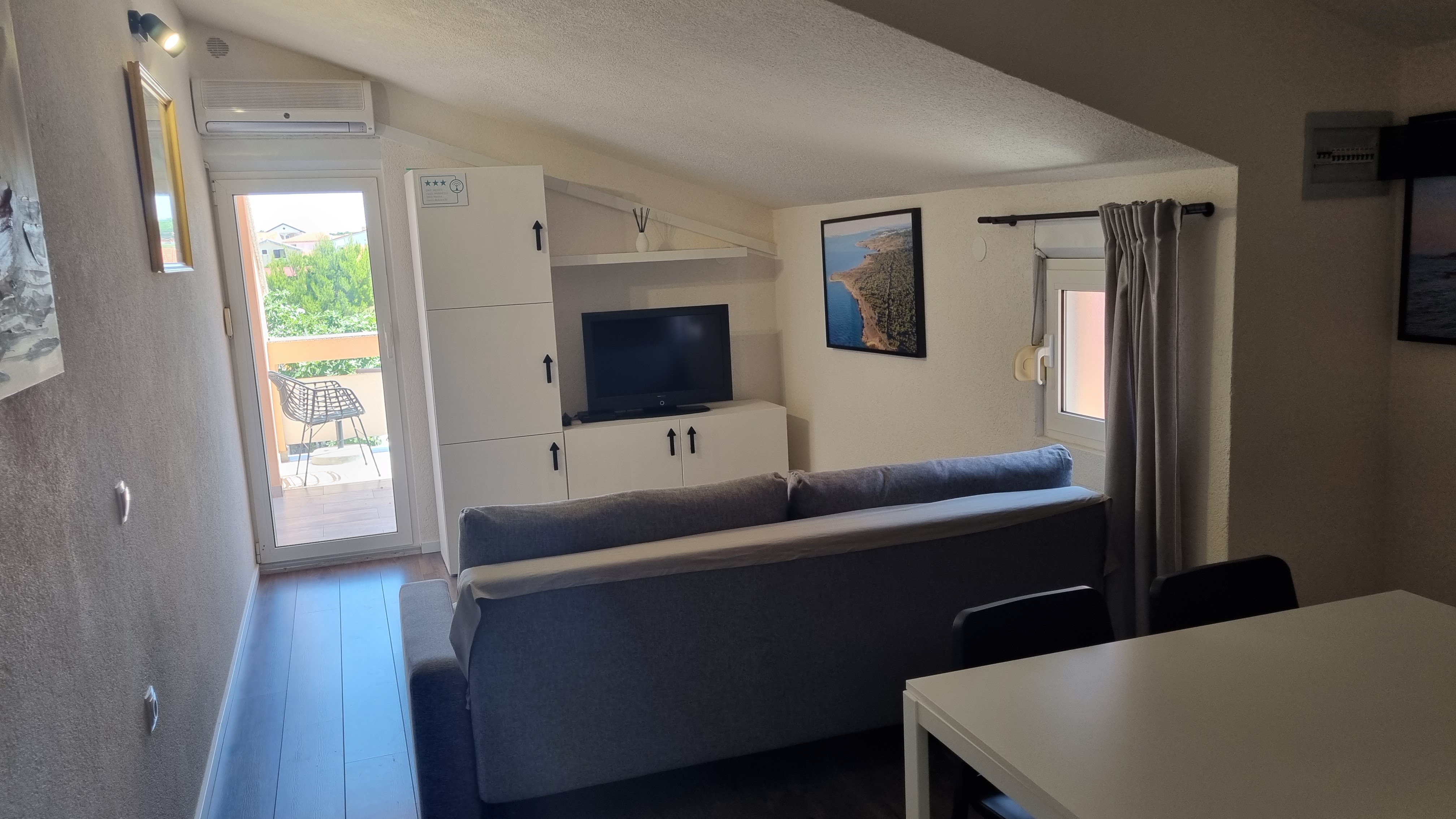 Apartmán má jednu ložnici, záchod, koupelnu, kuchyň s rozkládacím gaučem a velkou terasu ideální pro dva páry nebo rodinu s dětmi.