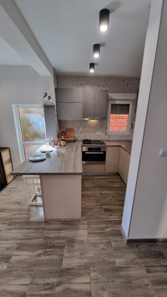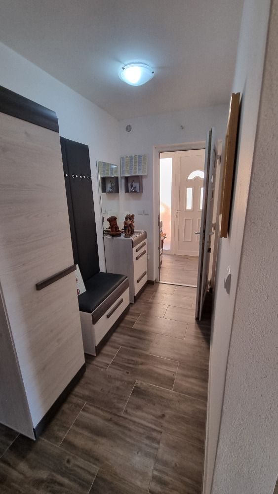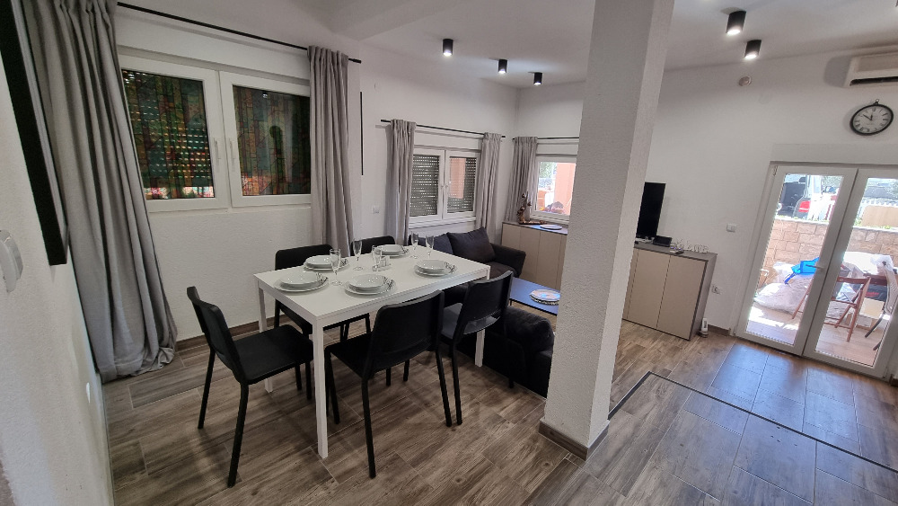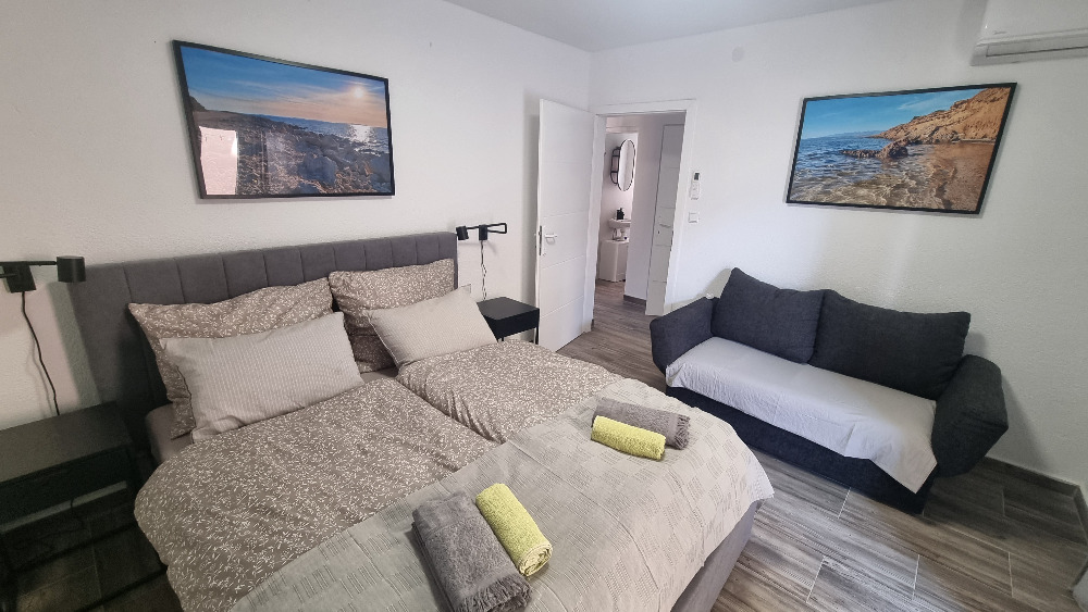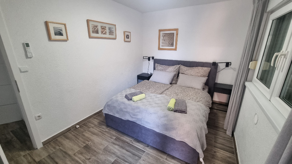 Apartmán má dvě ložnice, záchod, koupelnu, kuchyň s rozkládacím gaučem a velkou terasu ideální pro dva páry nebo rodinu s dětmi.